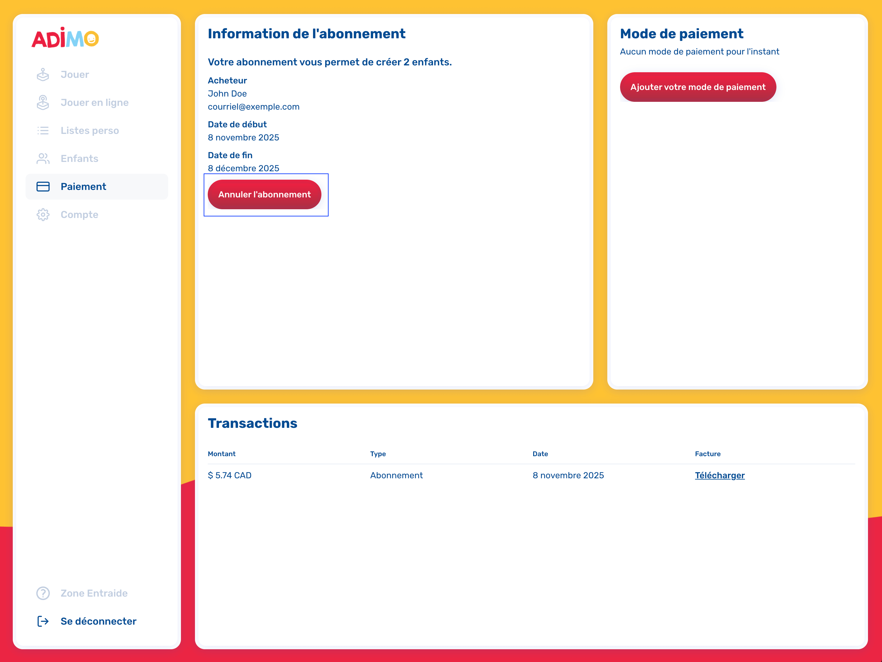 4. Dans la section « Information de l'abonnement » cliquez sur le bouton « Annuler l'abonnement ».